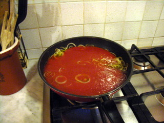 - Pour the tomato sauce in the pan with the onion and cook over medium heat for 10 minutes.