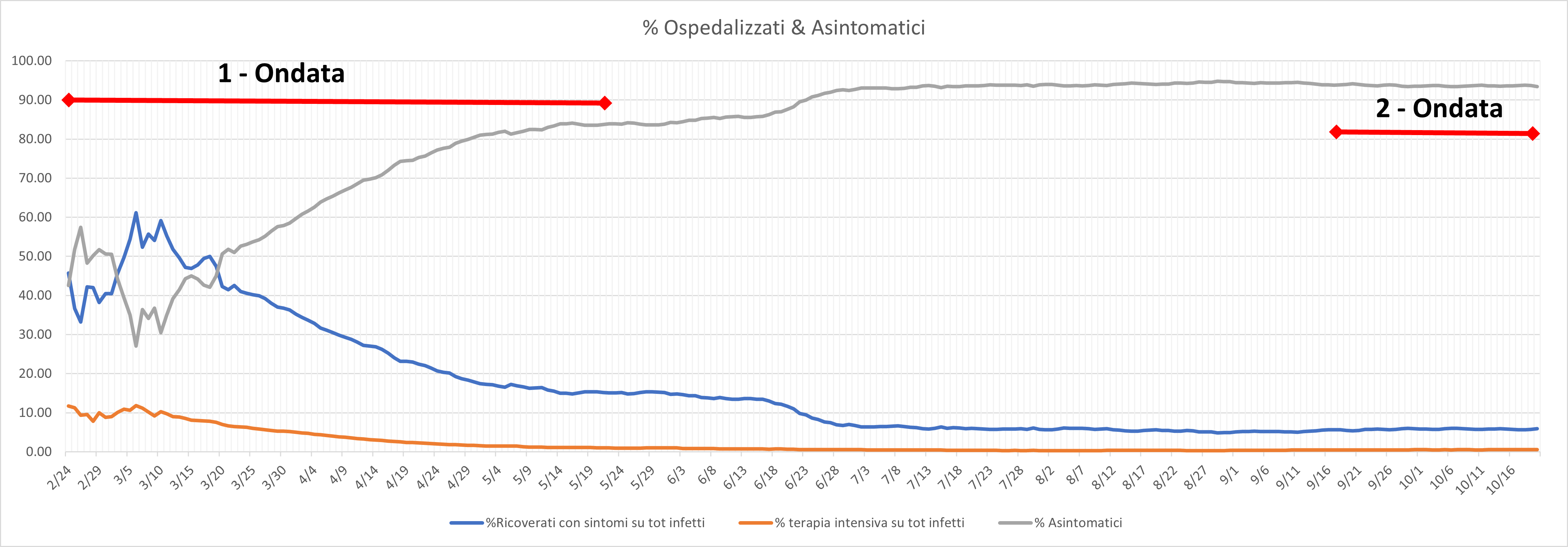 Il livello di asintomatici resta pero' intorno al 95% indicando che questa seconda ondata si sta mostrando si' aggressiva ma sino ad ora meno letale.