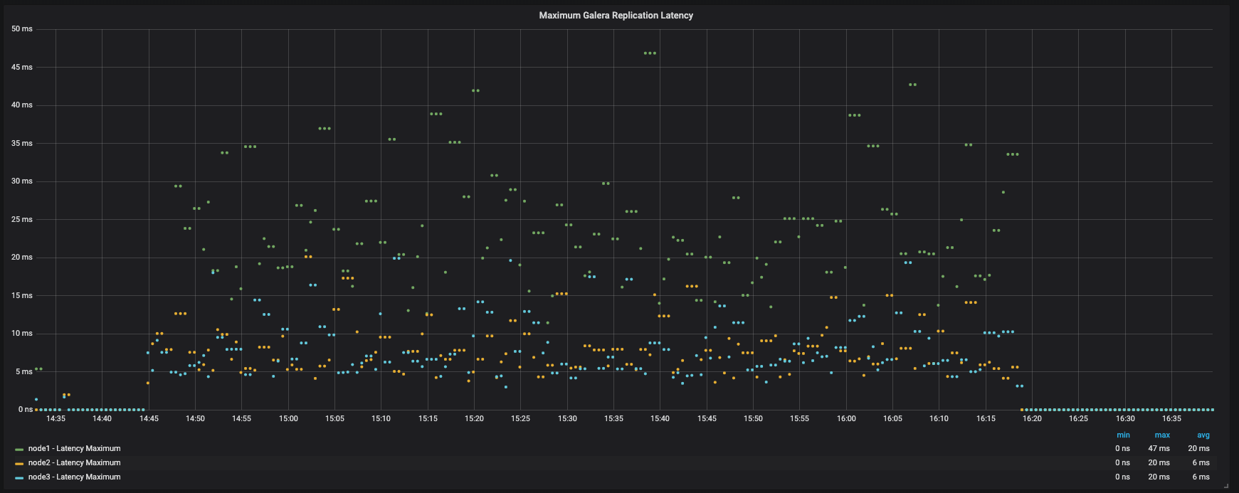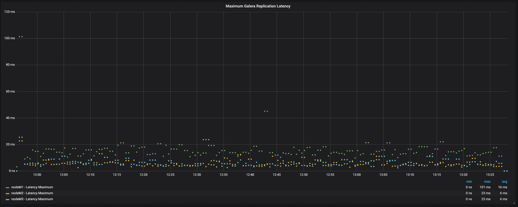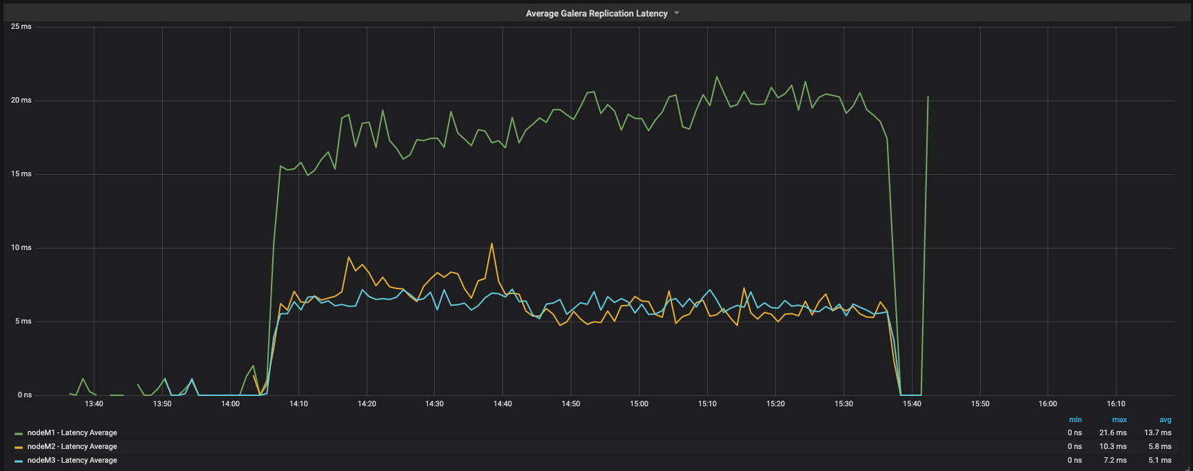 The latency in MariaDB was significantly higher around 19ms for the writer, and between 9 and 5 ms for the receivers.