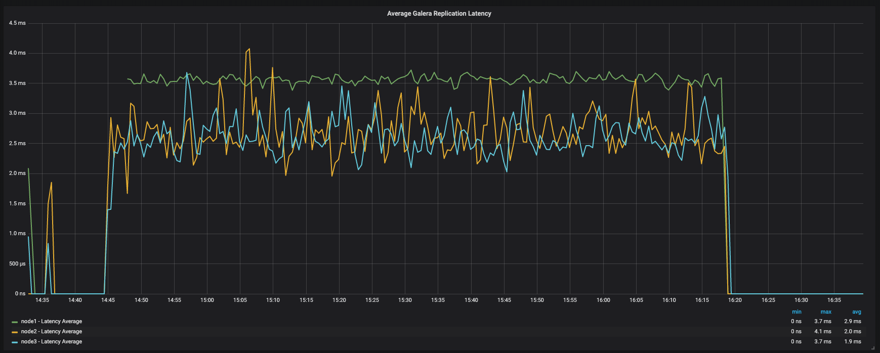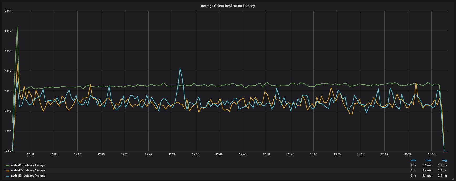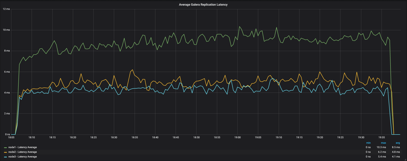 The average galera latency was around 9ms in the writer and around 5ms for the receivers in PXC. With same load, same machines, same configuration: