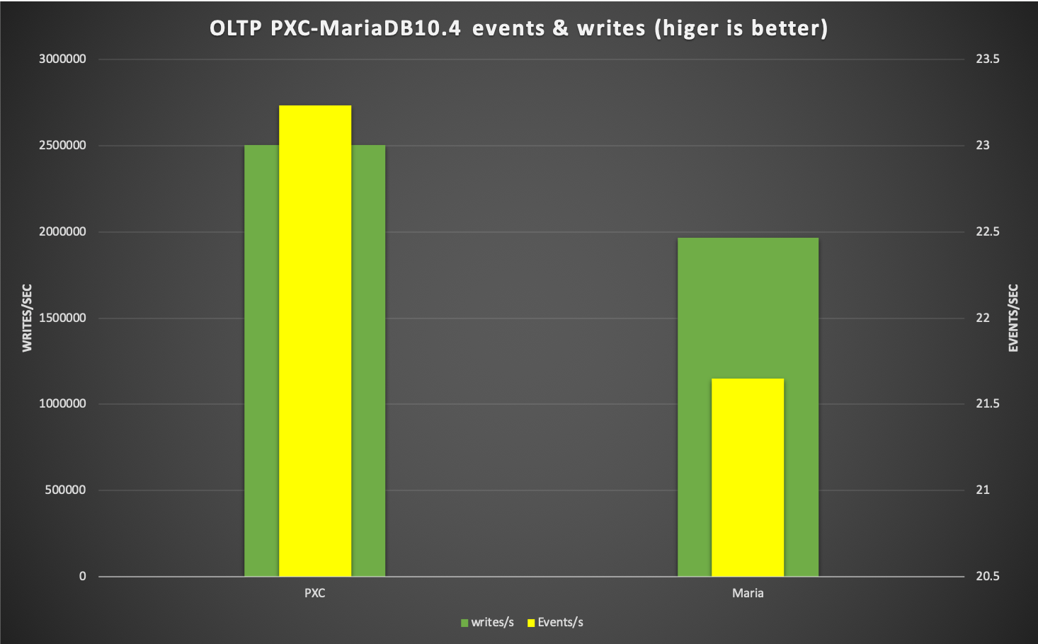PXC was performing better than MariaDB, executing more writes/s and and more events_thread/sec.