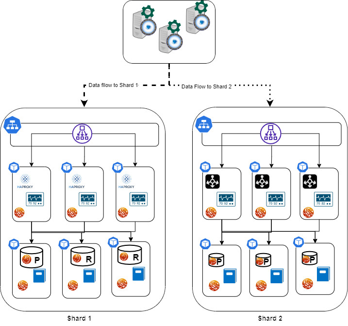 As the diagram above illustrates here we have a simple deployment but good enough to illustrate the sharding approach.