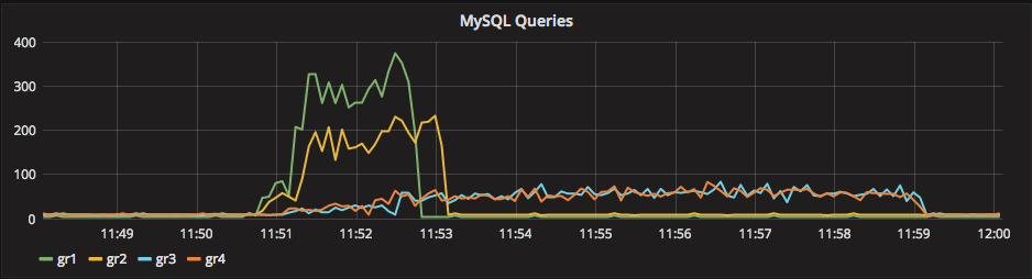 As you can see the traffic on the Secondary was significantly less 669 average than PXC 1.17K. Then it spikes when the main load on the PXC node terminates.